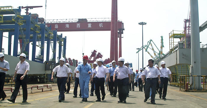在海西重機(jī)總裝現(xiàn)場(chǎng),張德平副市長(zhǎng)實(shí)地考察了待批量發(fā)往黎巴嫩的岸橋和輪胎吊項(xiàng)目、發(fā)往馬來(lái)西亞的帶斗門機(jī)項(xiàng)目、發(fā)韓國(guó)鮮光新港的軌道吊項(xiàng)目及承制、調(diào)試的功能性海工平臺(tái)項(xiàng)目等。并聽(tīng)取了海西重機(jī)董事長(zhǎng)孫國(guó)慶關(guān)于企業(yè)上半年經(jīng)濟(jì)運(yùn)行情況、轉(zhuǎn)型升級(jí)取得的成績(jī)以及在目前經(jīng)濟(jì)形勢(shì)下的合同承接情況。