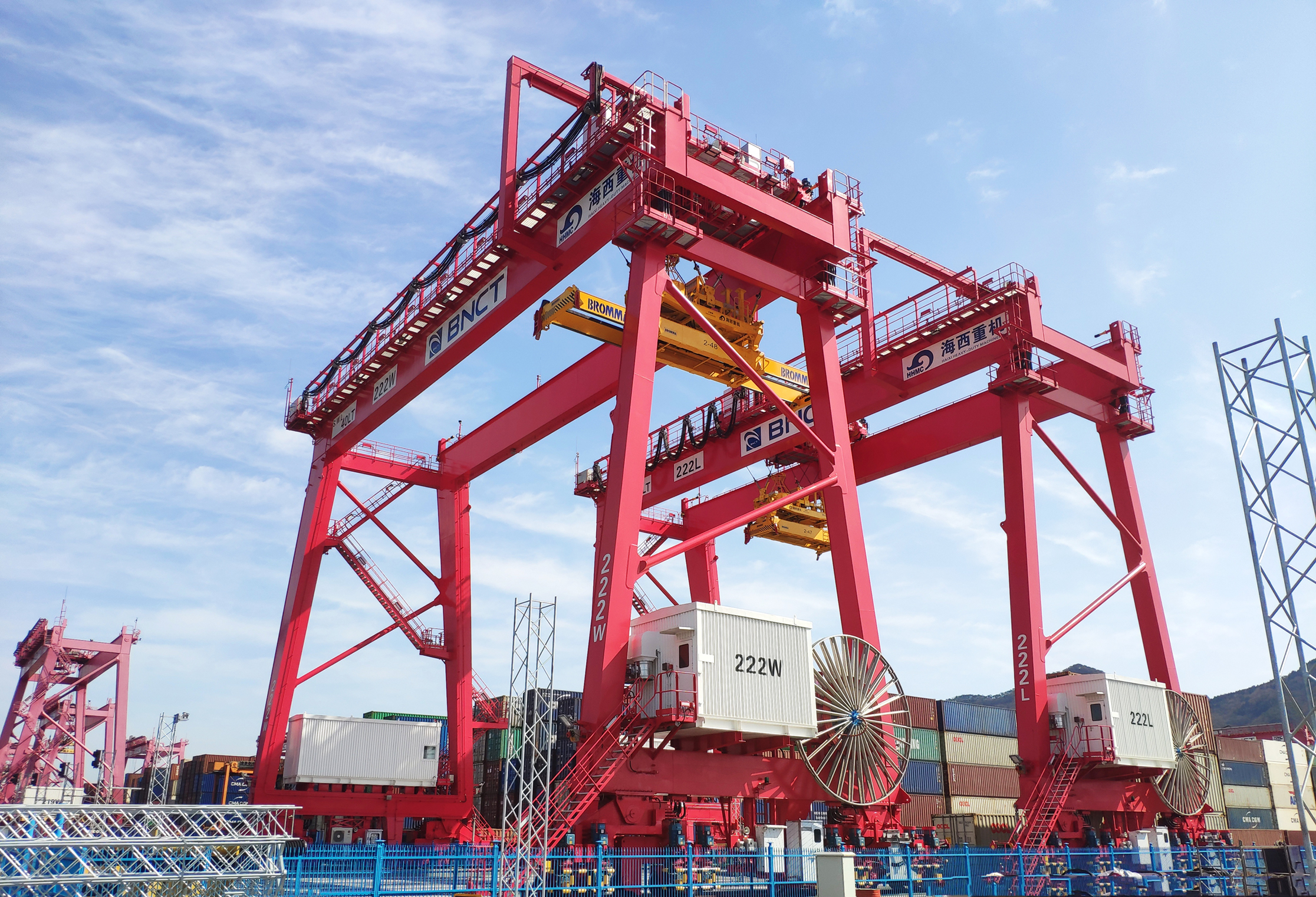 該批設(shè)備是雙方2019年簽訂的3臺(tái)65LT-70M岸邊集裝箱起重機(jī)、10臺(tái)40T自動(dòng)化軌道吊項(xiàng)目合同的第一批交付設(shè)備,應(yīng)用于BNCT運(yùn)營(yíng)碼頭——亞洲首個(gè)垂直布置的堆場(chǎng)自動(dòng)化碼頭。