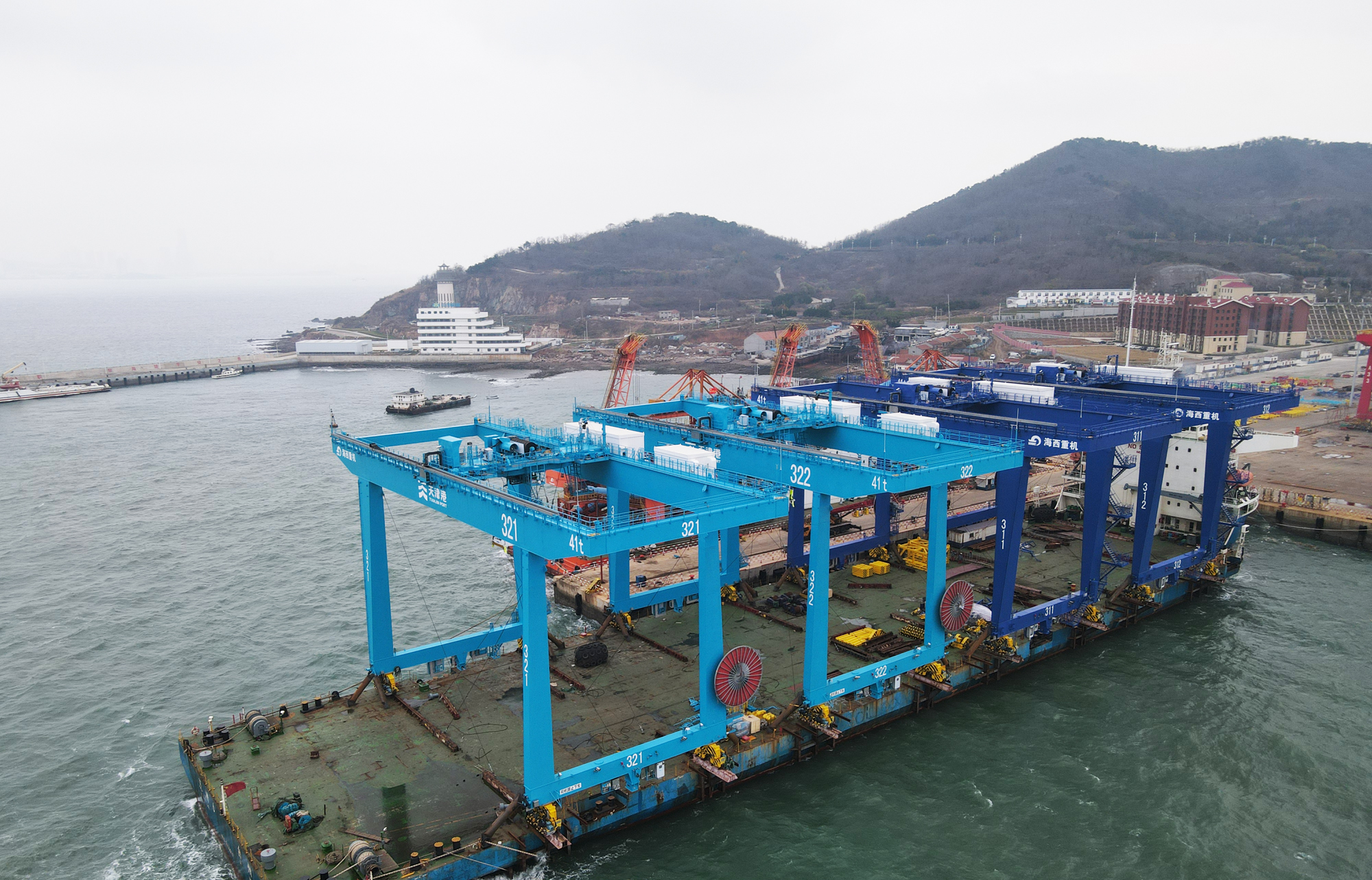 11月19日,裝載著天津港北疆港區(qū)C段智能化集裝箱碼頭一期工程項目第一批4臺藍色自動化軌道吊的運輸船“泛洲6”順利從中國船舶集團旗下武漢船機海西重機公司碼頭起航,發(fā)往天津港。