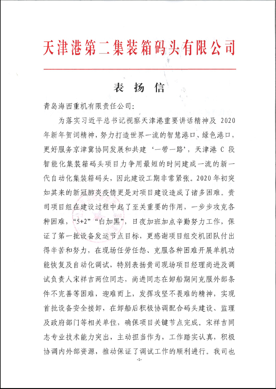 該項(xiàng)目第一批設(shè)備的發(fā)運(yùn)正值彼時(shí)天津疫情嚴(yán)重之際,海西重機(jī)項(xiàng)目組交機(jī)團(tuán)隊(duì)更是不畏艱難,勇于擔(dān)當(dāng)作為,馬上奔赴新的戰(zhàn)場(chǎng)。用戶(hù)在表?yè)P(yáng)信中,特別表?yè)P(yáng)了海西重機(jī)現(xiàn)場(chǎng)項(xiàng)目經(jīng)理尚進(jìn)和調(diào)試負(fù)責(zé)人宋祥吉。尚進(jìn)同志在卸船期間克服外部條件不完善等困難,迎難而上,發(fā)揮攻堅(jiān)無(wú)畏的精神,實(shí)現(xiàn)首批設(shè)備安全裝卸,在卸船后又積極配合碼頭建設(shè)、監(jiān)理及政府部門(mén)等相關(guān)單位,力保項(xiàng)目關(guān)鍵節(jié)點(diǎn)的完成。