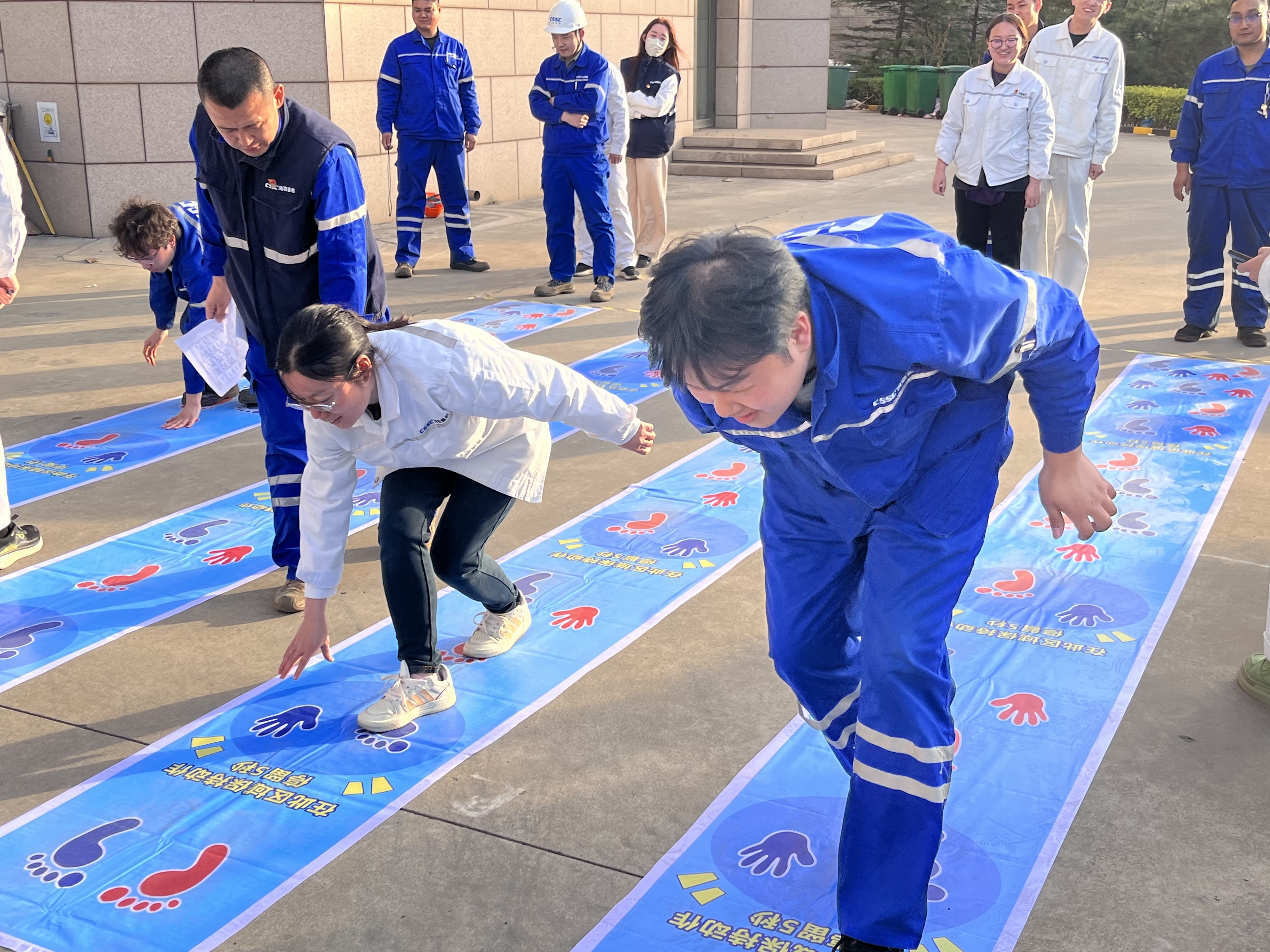 備受矚目的“巨人腳步”項目中,港口機械工程所的隊伍以口號統(tǒng)一步伐,如“鋼鐵巨人”般穩(wěn)步?jīng)_向終點,展現(xiàn)了驚人的默契。“集體跳長繩”更是高潮迭起,跳繩隊員的靈活身姿與搖繩者的精準節(jié)奏相得益彰,最后品質(zhì)管理部以3分鐘完成102次的佳績摘得單項冠軍。技術(shù)中心分會的謝士嬌在“摸石過河”中表現(xiàn)搶眼,她巧妙鋪磚、輕盈跨步,為團隊節(jié)省關(guān)鍵時間。“我們女同事可是‘戰(zhàn)術(shù)擔當’!”她賽后笑稱。