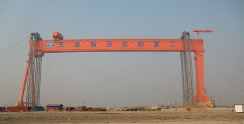 青島海西重機有限責任公司總承制的天津新港船舶重工有限責任公司臨港造修船基地首臺600噸×207米龍門吊,9月23日上午開始預提升,9月26日下午13點36分開始正式提升,于10月7日下午16點53分順利安裝到位,創(chuàng)下了國內同類型龍門吊提升時間最短紀錄。