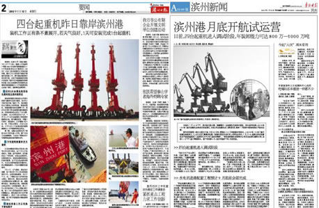 我公司為濱州港務有限責任公司承制的4臺MQ2533門座起重機于2012年7月10日運抵濱州港碼頭后,引起了當?shù)卣鐦O大關注。濱州市委書記、濱州市長辦公室、濱州市委組織部、濱州市海事局、濱州市公安局、以及各縣區(qū)級領導,先后到碼頭進行參觀指導,濱州日報、魯北晚報更是多次到碼頭進行采訪報道。