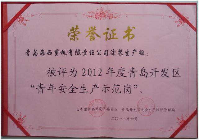 近日,青島海西重機涂裝生產(chǎn)組喜獲殊榮,獲評2012年度青島開發(fā)區(qū)“青年安全生產(chǎn)示范崗”榮譽稱號!