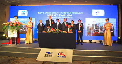 2014年7月2日,武漢船用機(jī)械有限責(zé)任公司與東方華晨集團(tuán),在青島海西灣青島海西重機(jī)舉行了10臺(tái)自升式海工平臺(tái)項(xiàng)目的合同簽字儀式。武漢船機(jī)董事長(zhǎng)何紀(jì)武、東方華晨集團(tuán)主席程立新先生等出席了簽字儀式。